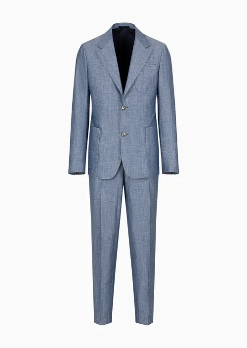 Traje de abotonadura sencilla confeccionado en tejido superligero de lana virgen mezclada con lino, compuesto por chaqueta y pantalones a juego. La chaqueta luce solapas de muesca, tres bolsillos de parche delanteros y estructura con mangas de camisa, mientras que los pantalones de corte recto y entallado presentan trabillas en la cintura. El diseño clásico y formal del traje se mezcla con la frescura de la tela utilizada, que permite usarlo con frecuencia incluso en pleno verano.